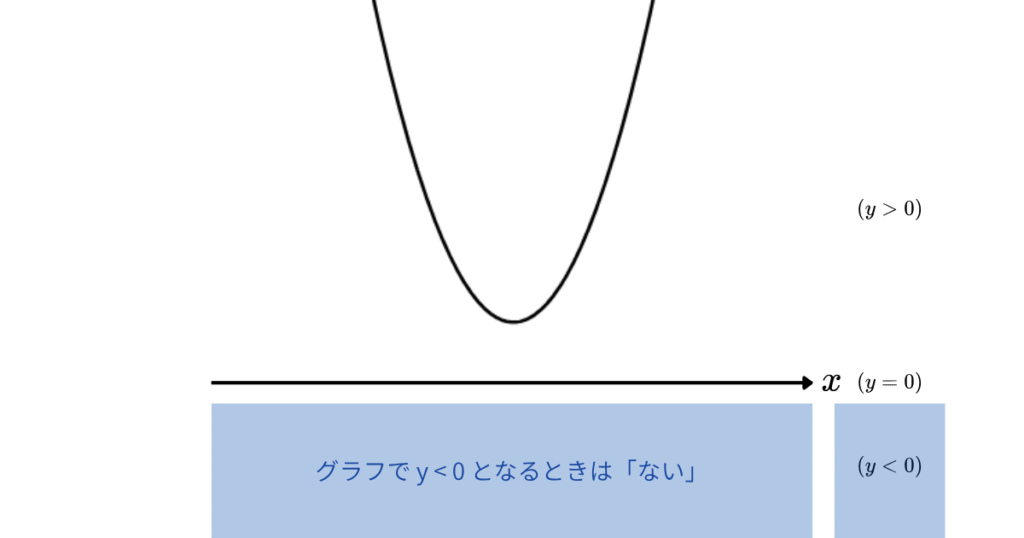 グラフと \(y=0\) つまり \(x\) 軸が「ぶつからない」ということ。